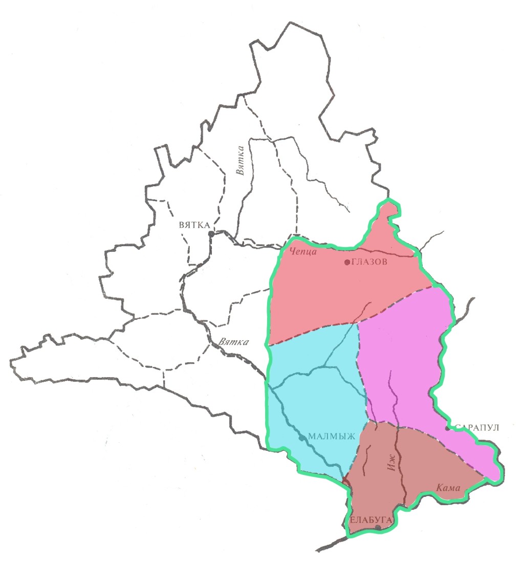 Но по сложившейся историографической традиции этот термин используется в отношении территории, заселенной преимущественно удмуртами, примерно соответствующей четырем уездам в пределах образованного в 1780 году Вятского наместничества, а позднее (с 1796 года) – Вятской губернии: Глазовскому, Елабужскому, Малмыжскому и Сарапульскому. Территория современной Удмуртии занимает около 66,5 % площади этих уездов [1, с. 6].