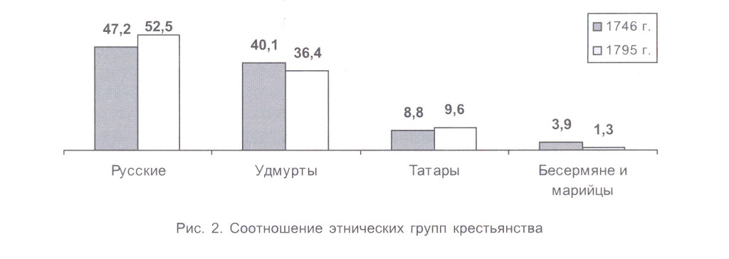 До последней четверти XVIII века население Удмуртии в большинстве своем было крестьянским. По этническому признаку сельское население распределялось на русских (самая многочисленная группа), удмуртов, татар, бесермян и марийцев (самая малочисленная группа) [1, c. 110]. В течение XVIII века продолжалось активное освоение русским крестьянством территории расселения удмуртов, что отчасти ускорило процессы русификации и христианизации удмуртов.