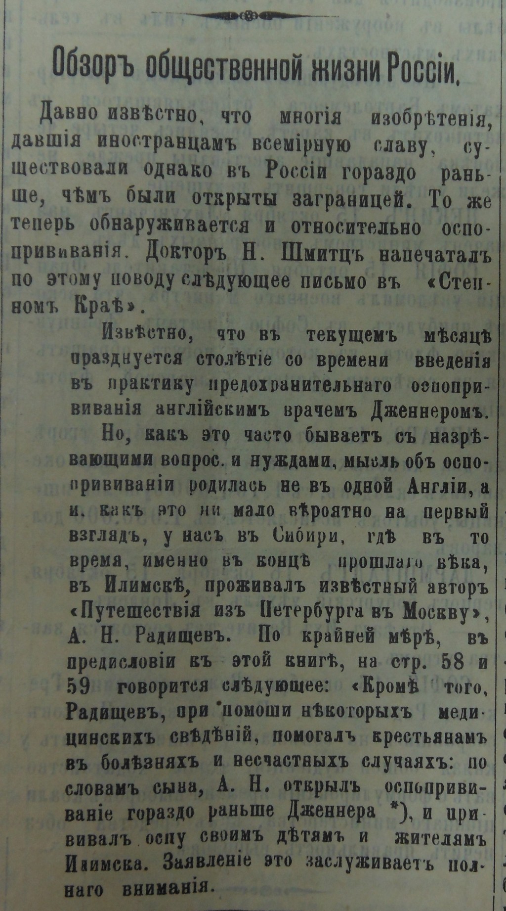 18 октября 1896 года в красноярской газете «Енисей» появилась перепечатка письма доктора Н. Шмица в омское издание «Степной край», в котором сообщались интересные факты из истории распространения практики оспопрививания.