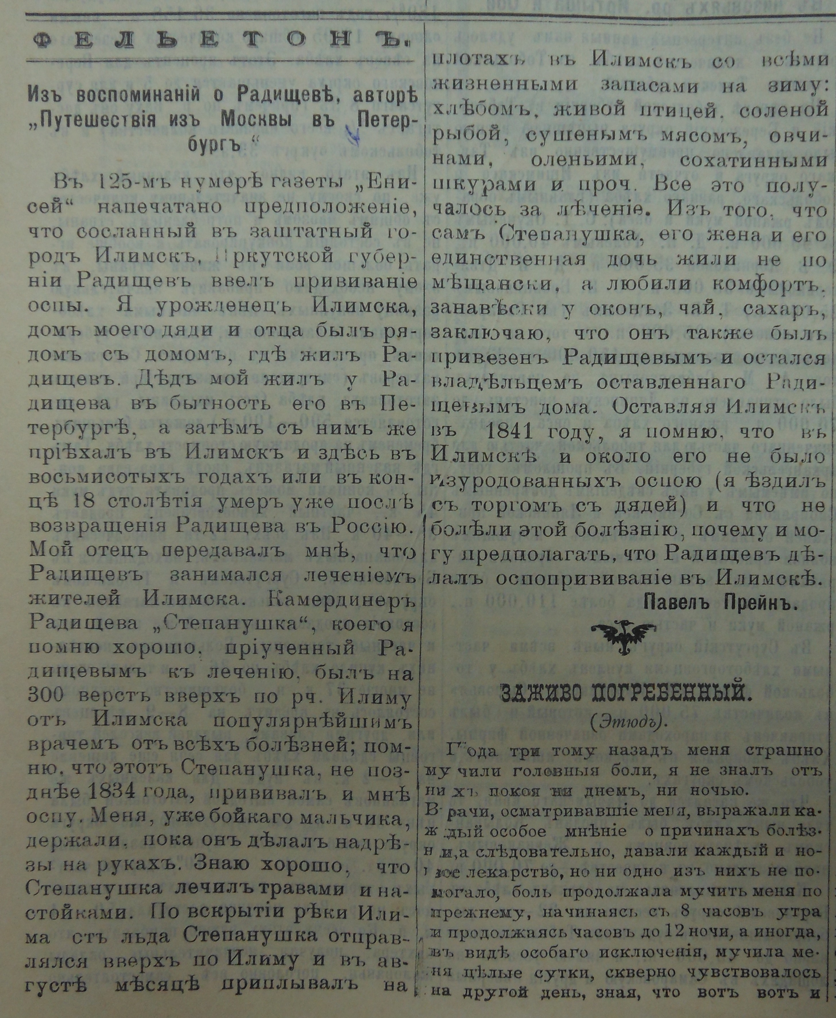 Эта публикация не осталась незамеченной, и уже через три номера в газете были обнародованы поступившие в качестве ответа воспоминания уроженца Илимска Павла Прейна, который хорошо знал ближайшего помощника Радищева по врачеванию – Степанушку [4].