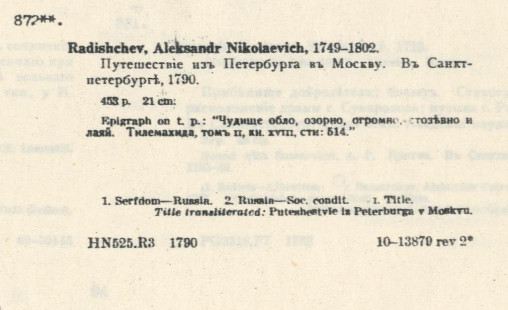 Только в 1961 году вашингтонское книгохранилище выпустило каталог из 1316 книг, изданных до 1800 года (Fessenko, T. Eighteenth century Russian publications in the Library of Сongress), но без указания их принадлежности к юдинской коллекции. В этом каталоге под номером 872 значится экземпляр книги Радищева «Путешествие из Петербурга в Москву».