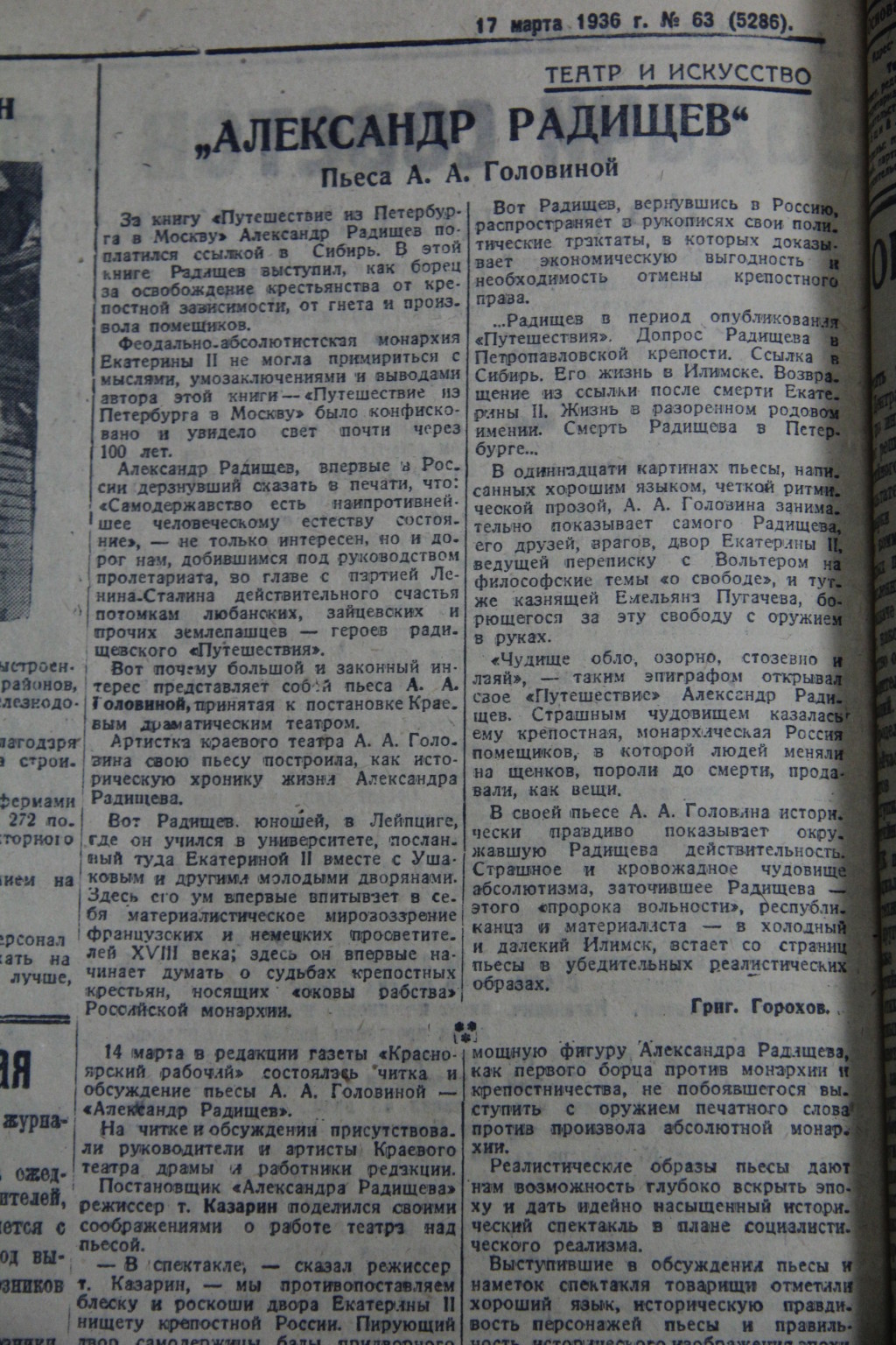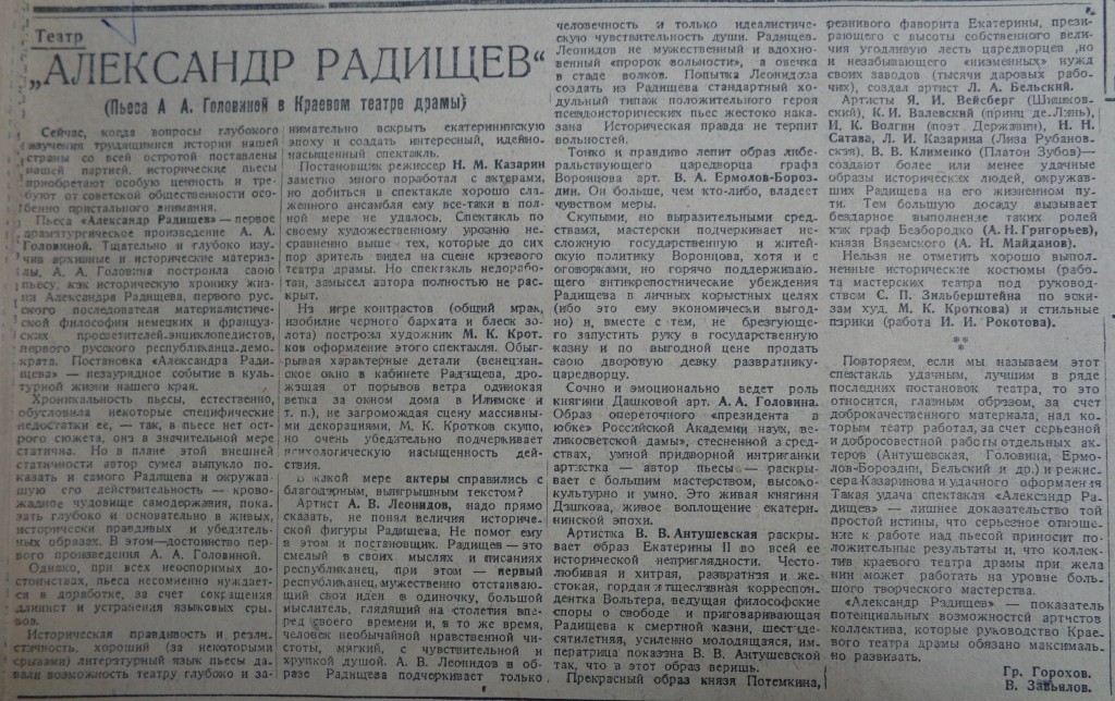 В 1936 году в Красноярском краевом театре драмы была поставлена историческая пьеса «Александр Радищев». Ее автором стала актриса театра Александра Аркадьевна Головина, режиссером – Николай Михайлович Казарин. Сохранившееся издание пьесы, а также материалы газеты «Красноярский рабочий», в которой удалось найти заметку о читке и обсуждении готовящегося к постановке текста и рецензию на премьерный показ спектакля, позволяют нам судить не только о достоинствах и недостатках самого произведения, но и об особенностях восприятия его советским зрителем и критикой.