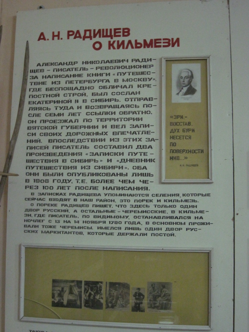 В память о том, что по пути своего следования в Сибирь в ночь с 13 на 14 ноября 1790 года А.Н. Радищев останавливался на ночлег в поселке Кильмезь, в Кильмезском районном краеведческом музее организована специальная экспозиция.